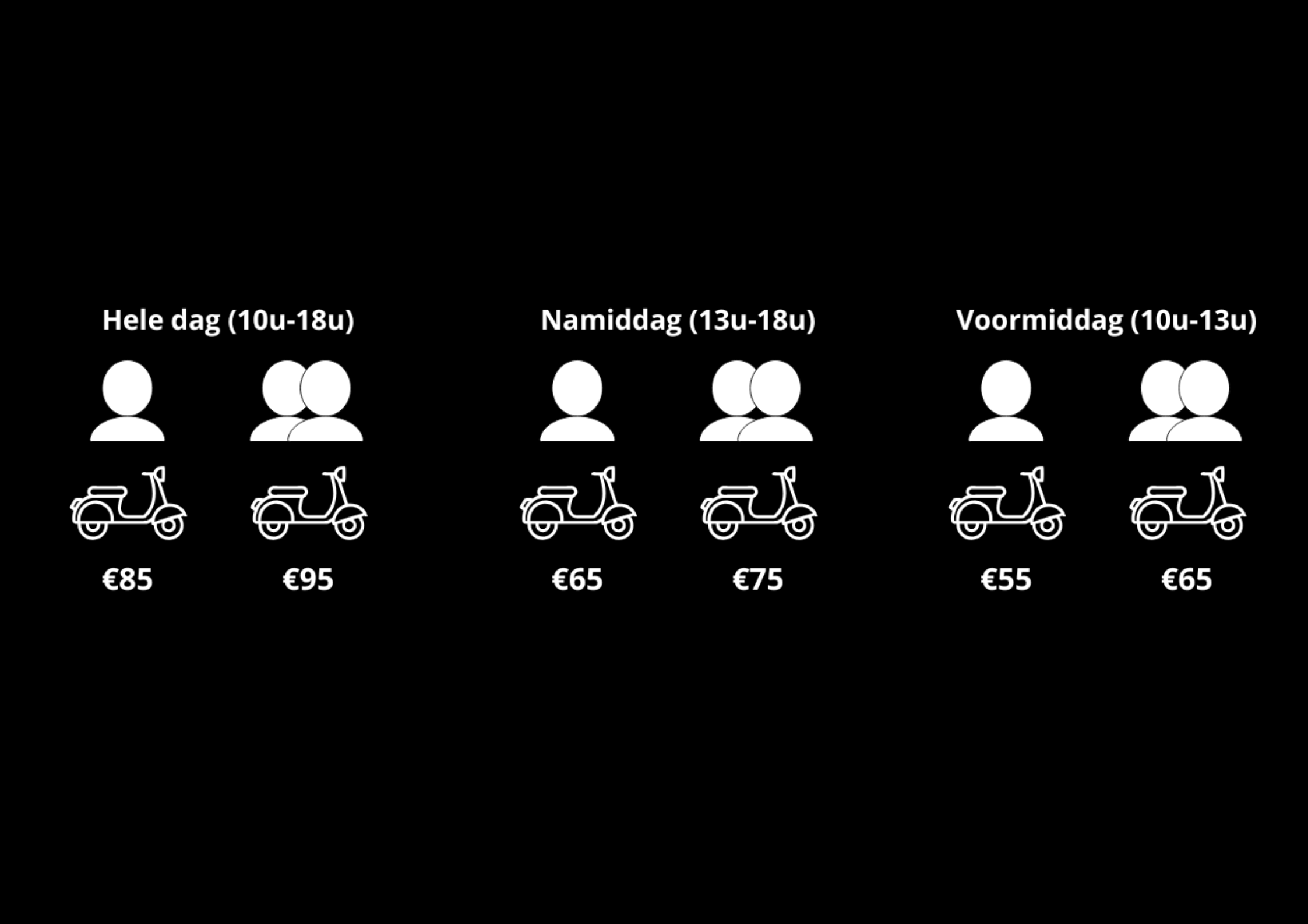 Selecteer eerst wanneer je een Vespa wilt huren. Nadien selecteer je het aantal Vespa’s. Je kan ook extra personen toevoegen die achterop zitten of een lekkere picknick reserveren voor onderweg. Of je sluit de dag af met een heerlijk 3-gangen menu bij Fresh!